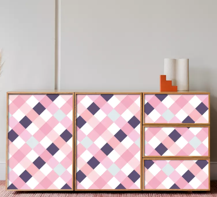 Transform your space with our Object sticker pink patterned surface, featuring a vibrant checkered design that brings together geometric shapes and colorful textures. This modern decor piece is perfect for enhancing furniture and drawers, adding a touch of personality to your home decor!