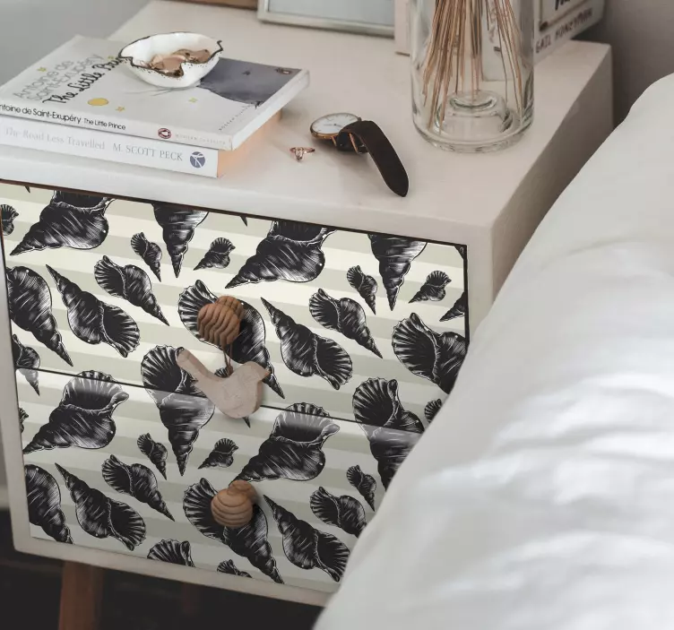 Introducing our stunning Object sticker shell print design, a beautiful blend of elegance and nature! This design features a captivating arrangement of shells, seashells, and stripes in a striking black and white palette, perfect for adding a touch of sophistication to your home decor. The intricate pattern evokes a sense of calm and tranquility, making it an ideal choice for any space that embraces the beauty of the outdoors.