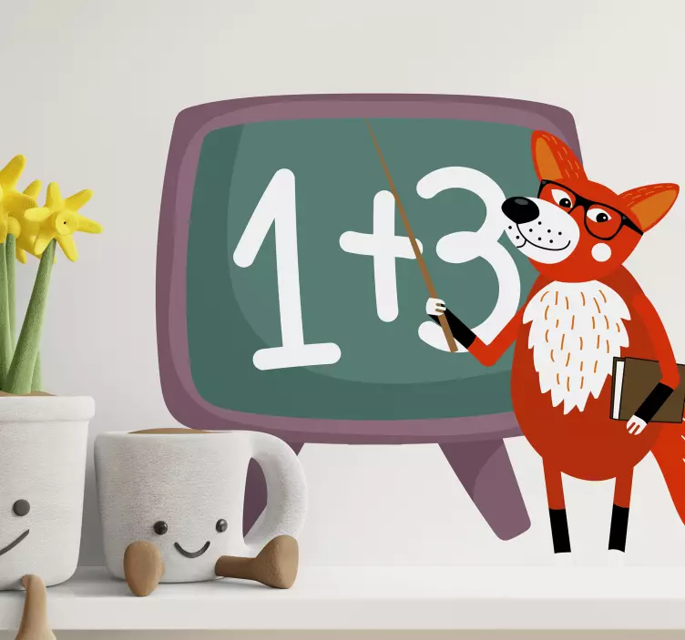 Reference: A50989A charming fox character stands by a chalkboard, playfully teaching a simple math equation. This engaging design features vibrant colors aimed at creating a fun learning environment, perfect for children's spaces. The fox, equipped with a pointer and a book, invites curiosity and enthusiasm in young learners.