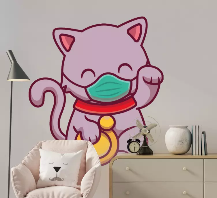 Transform your space with our delightful Wall sticker happy cat wearing mask. This charming design features a playful cartoon cat sporting a cute face mask, adding a whimsical touch to any room. Its vibrant colors and adorable expression are sure to bring joy and a sense of fun to your home decor.