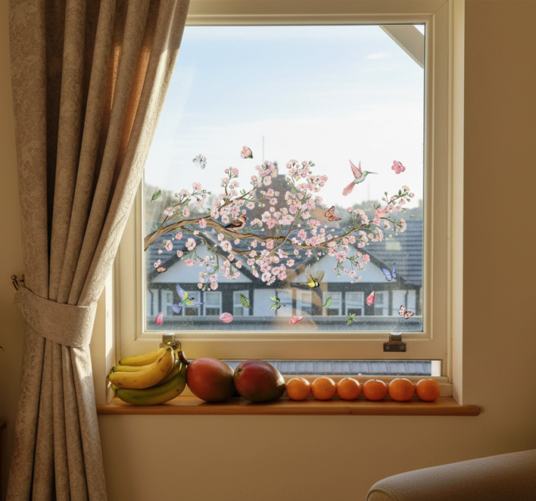 Reference: A53277Transform your space with our stunning Window sticker cherry blossom with birds. This enchanting design features delicate cherry blossoms intertwined with graceful birds, creating a serene and uplifting atmosphere. With a satin finish that minimizes glare, the vibrant colors stand out beautifully, inviting the charm of nature into your home. Enjoy the captivating view without reflections disrupting your peace, making this sticker a perfect accent for any window or flat surface!