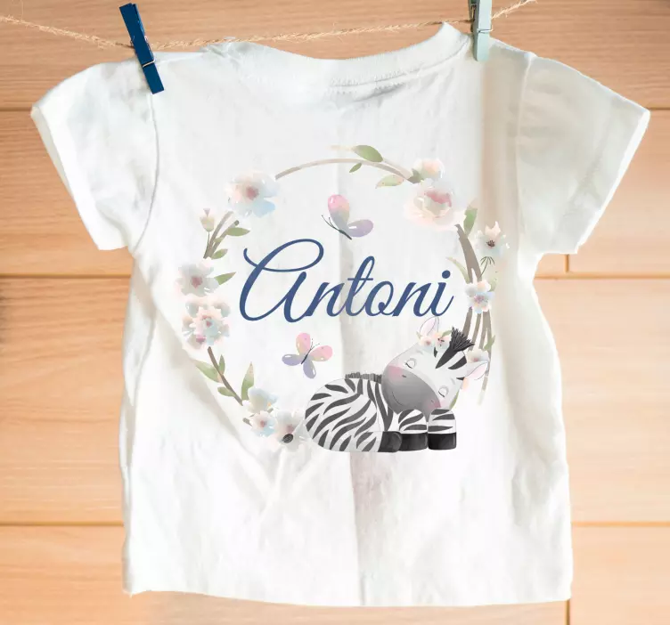 Introducing our Baby t-shirt personalized zebra nursery design—a whimsical masterpiece featuring an adorable zebra sleeping peacefully within a beautiful floral wreath. This enchanting design is created with vibrant watercolour elements that capture the essence of a serene nursery atmosphere. With the option to customize the name, this personalized t-shirt is not only cute but also a perfect keepsake for your little one!
