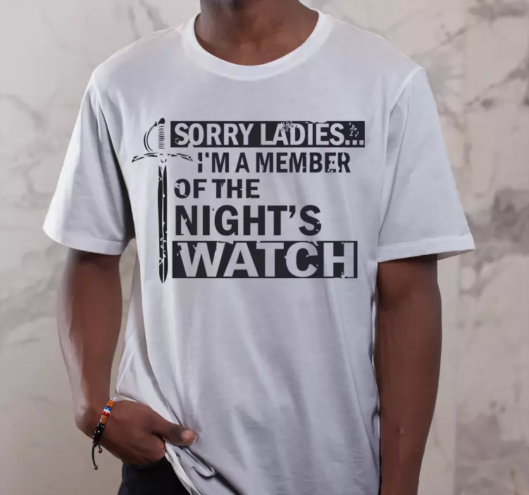 Reference: T4932This white shirt features a bold statement emphasizing membership in the night's watch, paired with a striking sword graphic. Perfect for those looking to showcase their fandom humorously while enjoying comfortable casual wear.
