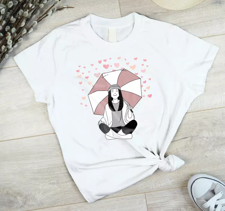 Introducing our Charming heart pattern t-shirt, a delightful fusion of art and comfort! This eye-catching design showcases a cute girl holding an umbrella, surrounded by cheerful hearts that radiate love and joy. The playful cartoon illustration captures the essence of a rainy day, making it perfect for casual outings. With its comfortable fit, this female t-shirt is not just a piece of clothing; it's a statement of style and happiness!