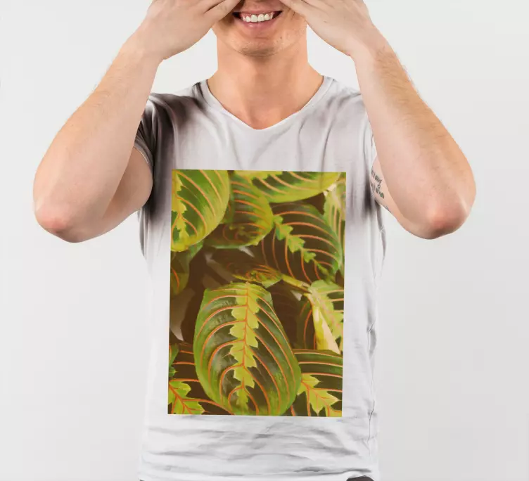 The Green Leaf Pattern T-Shirt features a stunning graphic design inspired by the vibrant and exotic elements of nature. With beautifully illustrated maranta leaves, this t-shirt captures the essence of the tropical jungle in a fresh and lively way. The botanical illustration showcases intricate textures of green foliage, bringing the beauty of the outdoors right to your wardrobe!