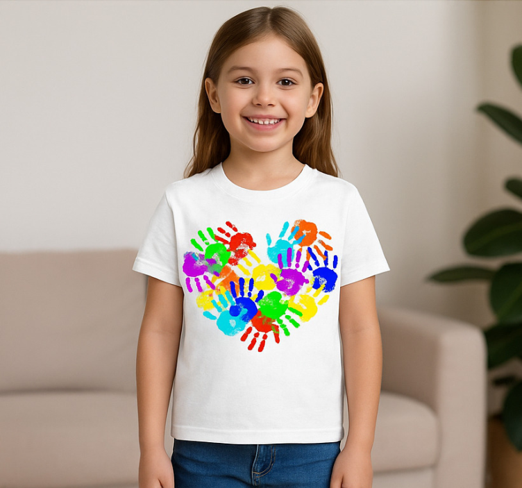 The Heart-shaped handprints t-shirt is easy to care for! Simply machine wash at 30 degrees to keep it looking fresh and vibrant. For best results, iron the t-shirt inside out or use a barrier cloth to protect the design. Enjoy wearing this delightful piece without any hassle!