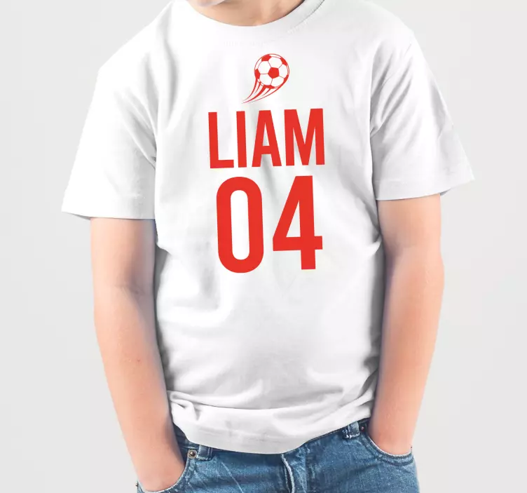 Introducing the Kids t-shirt Liam Soccer Game, a perfect blend of style and sport! This eye-catching design features a vibrant football graphic, complete with a ball and personalized elements like your child's name and number. Crafted for young fans, this custom kids t-shirt is ideal for budding players who love to showcase their passion for sports. The striking combination of white and red colors makes it a standout choice for any soccer-themed event!