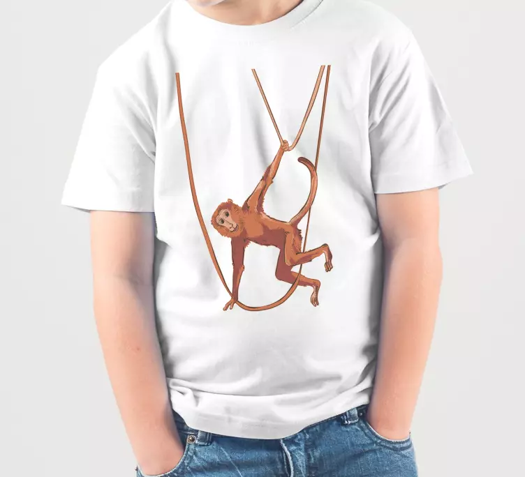 Introducing our delightful Kids t-shirt monkey swinging on a rope, featuring a vibrant illustration of a playful monkey swinging joyfully on a rope! This design captures the essence of adventure and fun, making it perfect for children who love animals and nature. The charming ape showcases an exciting and friendly demeanor that will surely bring smiles to your little ones as they wear it!