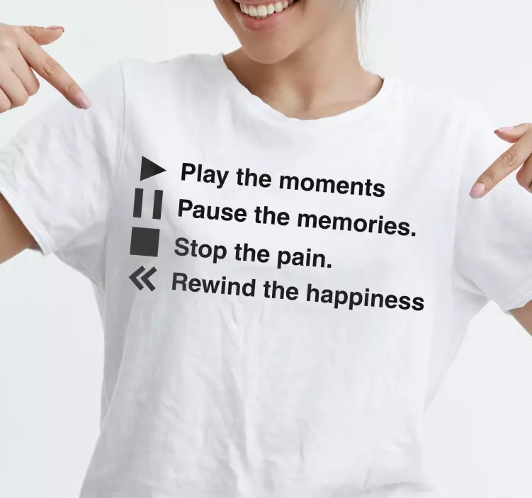 The Moments of happiness t-shirt features a captivating design that blends elements of play, pause, and stop, all intertwined with motivational text. This unique t-shirt embodies emotions and memories, delivering a powerful message of happiness through inspiring slogans and quotes. The striking black and white contrast makes it a versatile addition to any wardrobe, radiating positivity and joy!