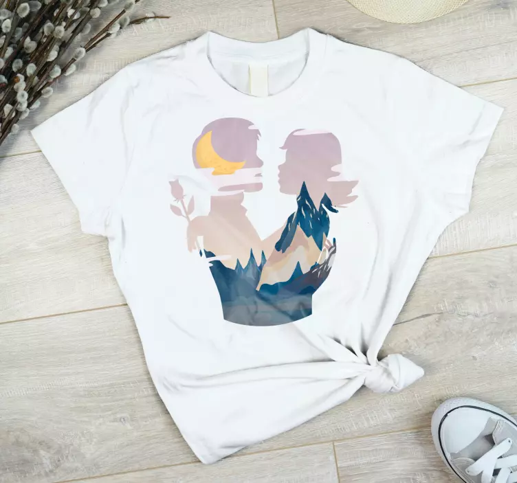 Introducing our stunning Mother and daughter t-shirts silhouette of bonding, beautifully designed to capture the essence of love and togetherness. This unique graphic features a nipponese style illustration that showcases a mother and daughter silhouette against a backdrop of serene mountains and a glowing moon. The design embodies the tenderness of a familial bond, celebrating the beauty of nature and the special connection between a mother and her child.