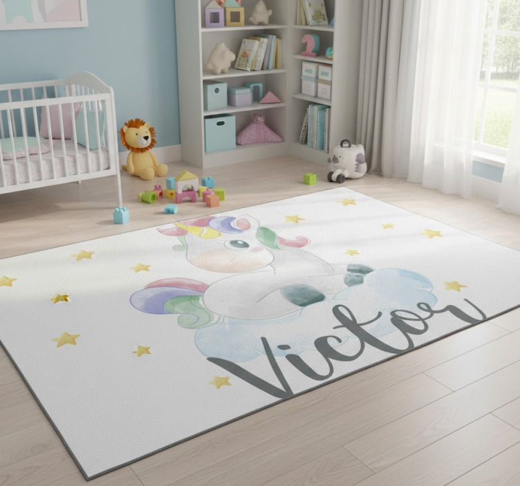 Reference: R20386Transform your space with the enchanting Animal vinyl rug watercolor unicorn with clouds. This delightful rug features a whimsical design that showcases a charming unicorn floating among fluffy clouds, creating a magical atmosphere in any room. The vibrant colors and artistic watercolor style bring joy and creativity to your decor, making it a perfect addition for children's rooms, play areas, or any space that needs a touch of fantasy!