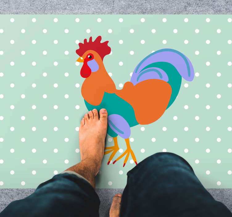 Brighten up your space with our stunning Animal vinyl rug with colorful rooster design! This playful piece features a vibrant illustration of a rooster set against a delightful pattern background filled with energetic polka dots. The cartoonish style adds a fun touch, making it the perfect addition to any room that needs a cheerful vibe.