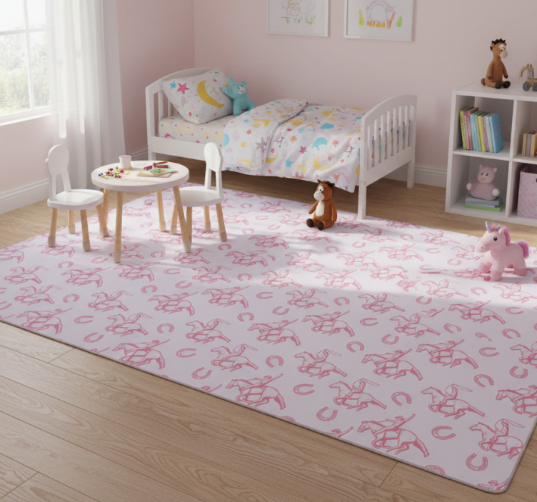 Reference: R20408Introducing the stunning Animal vinyl rug with pink cowboy horse pattern, a delightful addition to any space! This vibrant design features an enchanting pink cowboy horse motif that brings a playful and energetic vibe to your home. Crafted with care, this rug showcases a perfect blend of style and functionality, making it a true centerpiece for your decor.