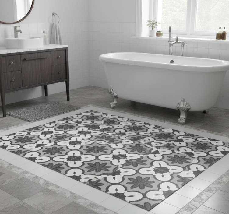 Reference: R23531Transform your bathroom into a stylish oasis with our Bathroom vinyl rug in hydraulic gray gracia style. This stunning design features intricate patterns that evoke a sense of elegance and modernity, making it the perfect addition to your decor. With its easy-to-clean surface, anti-slip backing, and scratch-resistant material, this rug not only enhances the aesthetic appeal but also protects your floors while providing thermal insulation.