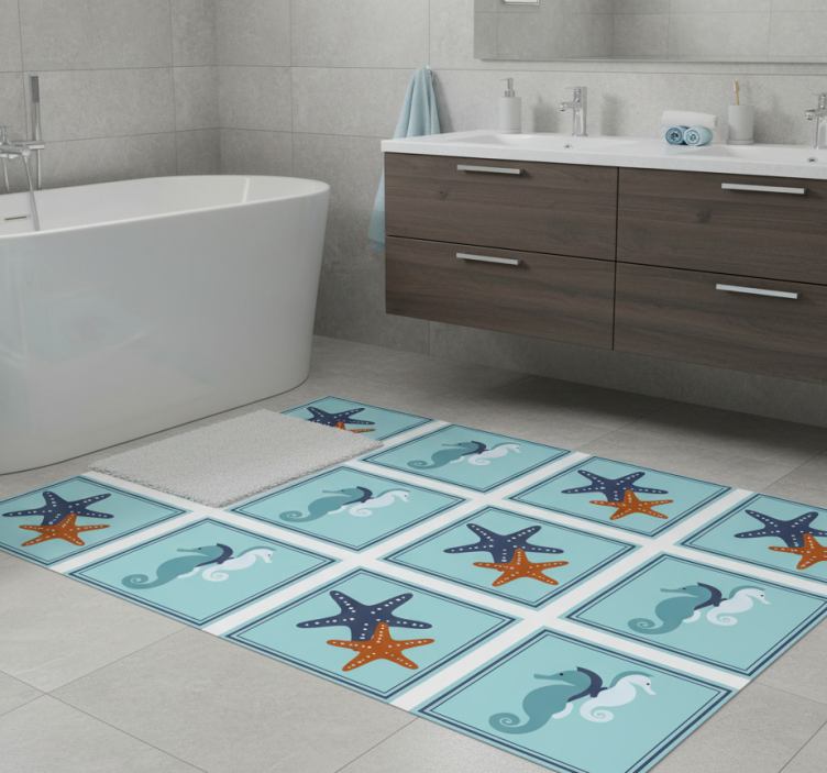 The Bathroom vinyl rug in marine style tile bathroom vinyl rug is a delightful addition to any bathroom decor. Its unique design effortlessly brings the calming essence of the ocean right into your home. Not only does it enhance the aesthetic appeal, but it also provides comfort underfoot. Imagine stepping onto a soft, stylish rug that transports you to a beach paradise every day!