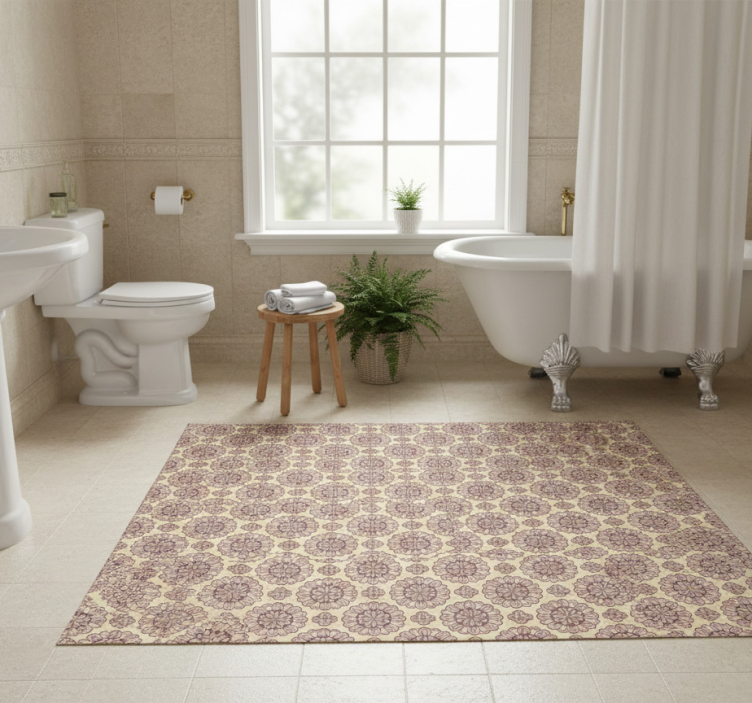 Embrace the beauty of the Bathroom vinyl rug in purple ethnic mandala bathroom vinyl rug as a perfect decorative piece! Its enchanting design will uplift your bathroom decor, offering a harmonious blend of elegance and comfort. This rug not only enhances aesthetics but also adds a cozy touch that invites tranquility, making every visit to your bathroom a delightful experience.