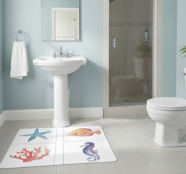 The Bathroom vinyl rug marine animals bathroom vinyl rug is the perfect decorative piece to enhance your bathroom's ambiance! Its eye-catching design adds a splash of color and whimsy while protecting your floors. Imagine stepping onto a cozy, beautiful marine-themed rug that not only elevates your decor but also makes your bathroom feel inviting and fun for the whole family. Why not dive into a world of creativity and charm with this fantastic rug?