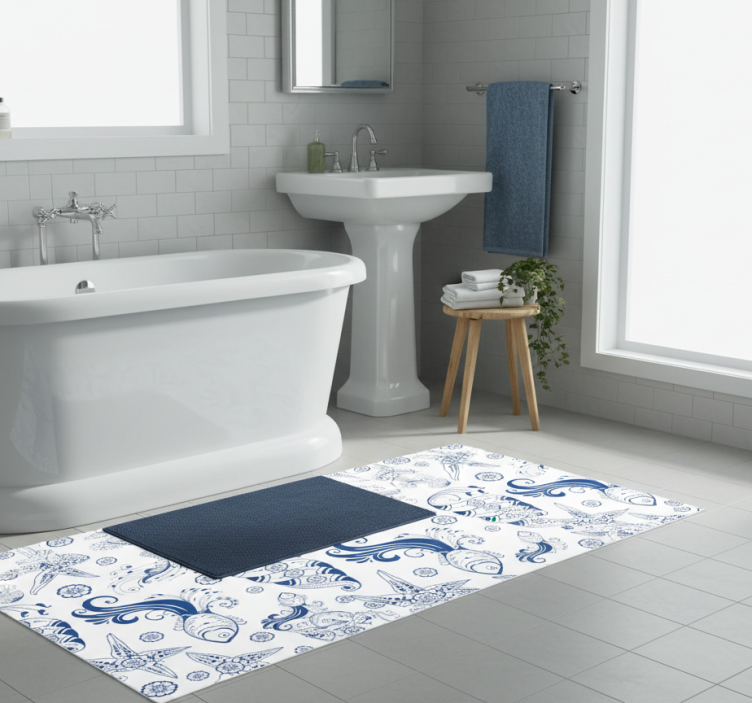The Bathroom vinyl rug ornamental sea life design bathroom vinyl rug is not just a rug; it's a statement piece that adds a splash of color and personality to your space. The enchanting sea life patterns inspire tranquility and joy, inviting you to create a refreshing atmosphere that rejuvenates your senses every time you step out of the shower. Elevate your bathroom décor effortlessly with this exquisite rug!