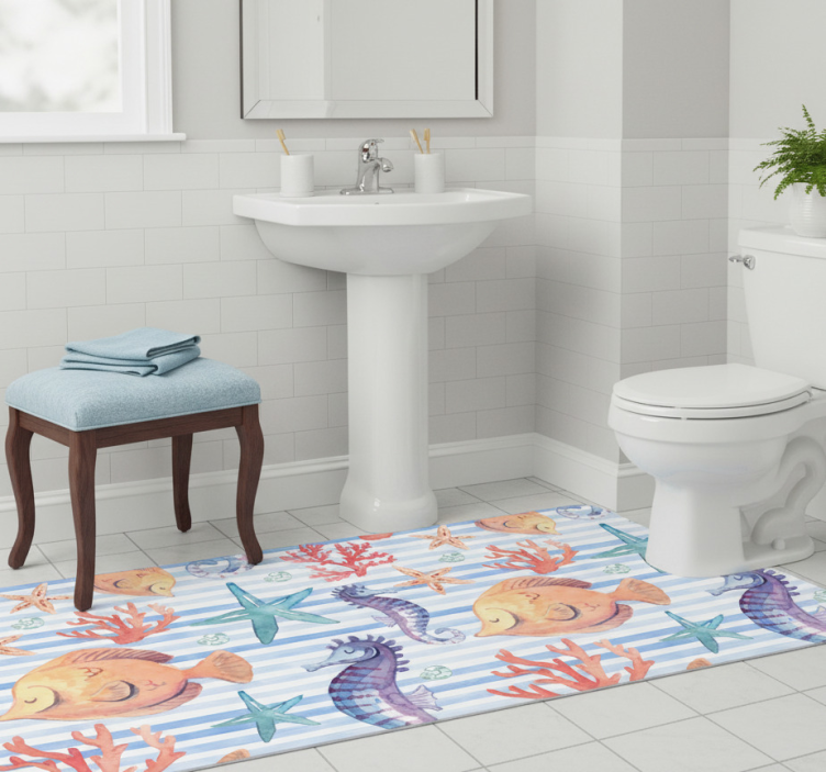 The Bathroom vinyl rug sea life tiles design bathroom vinyl rug is not just a functional item but a statement piece that enhances your bathroom's aesthetic. Imagine stepping onto a soft, beautifully designed rug that transports you to a tranquil seaside escape! This rug effortlessly combines style and comfort, making it an essential addition to your decor.