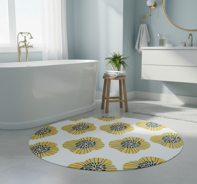 Transform your space with the Bathroom vinyl rug with big blue and yellow flowers bathroom vinyl rug, a perfect blend of style and functionality! This eye-catching piece can uplift your bathroom decor, adding a splash of color and personality. Imagine stepping onto this beautiful rug every morning, instantly brightening your day and creating an inviting atmosphere for guests!