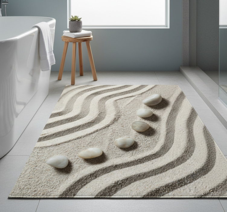 Reference: R21348Transform your bathroom into a serene oasis with our Bathroom vinyl rug zen path sand design. This beautifully crafted rug features a calming sand design that evokes the tranquility of a zen garden. With its easy-to-clean surface, anti-slip properties, and scratch-resistant material, this rug not only enhances your decor but also protects your floors while adding a touch of elegance!