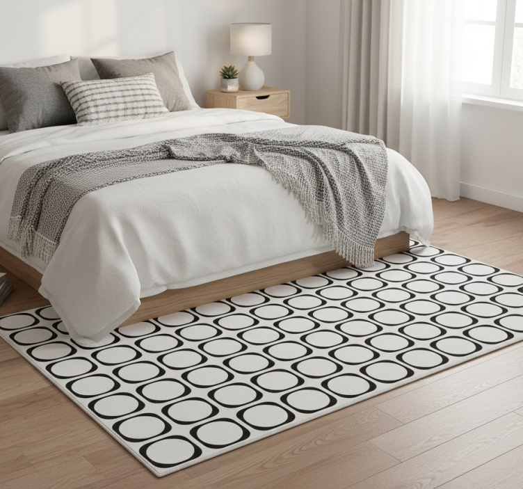 Elevate your interior design with the Bedroom vinyl rug in black and white tiles bedroom vinyl rug, an ideal choice for those looking to create a chic and inviting atmosphere. Its captivating pattern adds depth and character to your bedroom, allowing you to express your unique style while enjoying the warmth and comfort it brings!