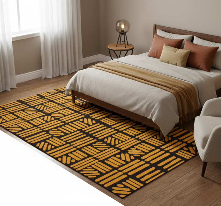 Reference: R23970Transform your space with our stunning Bedroom vinyl rug with african style golden art. This exquisite design features captivating patterns and rich golden hues that echo the essence of African artistry. The vibrant colors and intricate motifs create a mesmerizing visual experience, making it a perfect addition to any bedroom seeking a touch of elegance and warmth. Not only does this rug enhance your decor, but it also offers practical benefits such as being easy to clean, anti-slip, and scratch resistant!