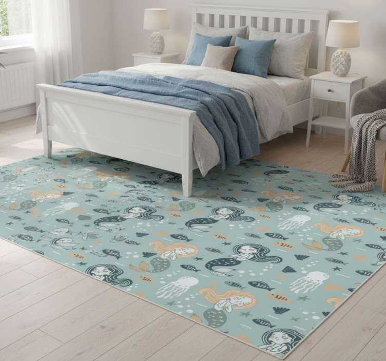 Maintaining the beauty of your Bedroom vinyl rug with blue magic mermaid design bedroom vinyl rug is easy! Simply wipe it down with a damp cloth and mild soap, and it will look as good as new. This hassle-free cleaning method ensures that your rug remains vibrant and fresh for years to come!