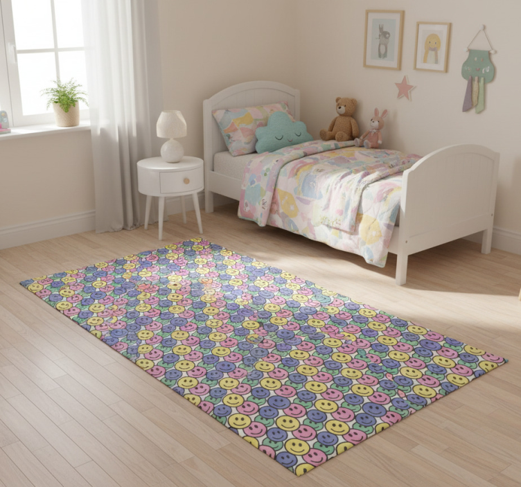 Bedroom vinyl rug with colorful pastel smiley faces