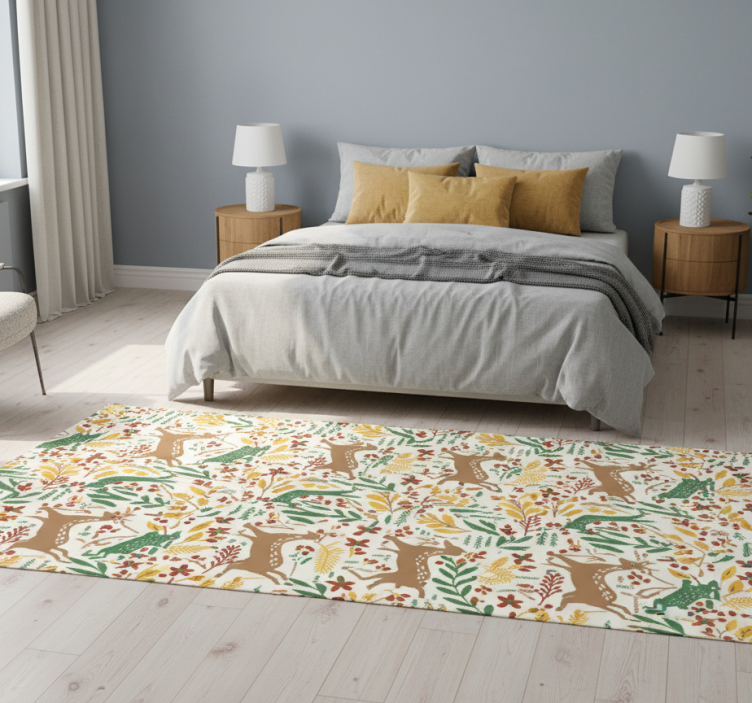 Reference: R22163Transform your space with the stunning Bedroom vinyl rug with gray deer and yellow flowers. Featuring a delightful blend of elegant gray deer set against a backdrop of vibrant yellow flowers, this rug exudes charm and warmth. Its unique design not only enhances the aesthetic appeal of any bedroom but also adds a touch of nature-inspired beauty that will make you feel right at home!