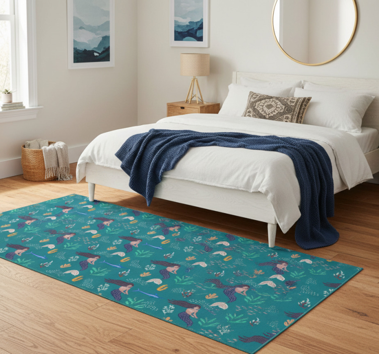 Maintaining the beauty of your Bedroom vinyl rug with mermaids and swordfish bedroom vinyl rug is simple and hassle-free. Just wipe it down with a damp cloth or use a mild detergent for deeper cleaning. Enjoy a fresh and vibrant rug that adds charm to your space!