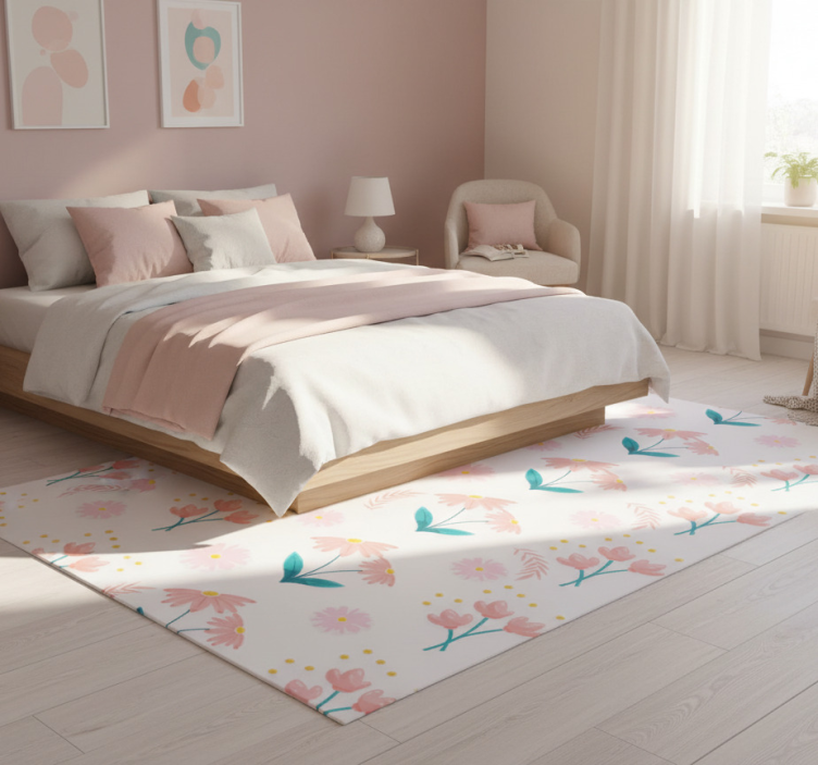 Bedroom vinyl rug with minimalistic pastel flowers and dots
