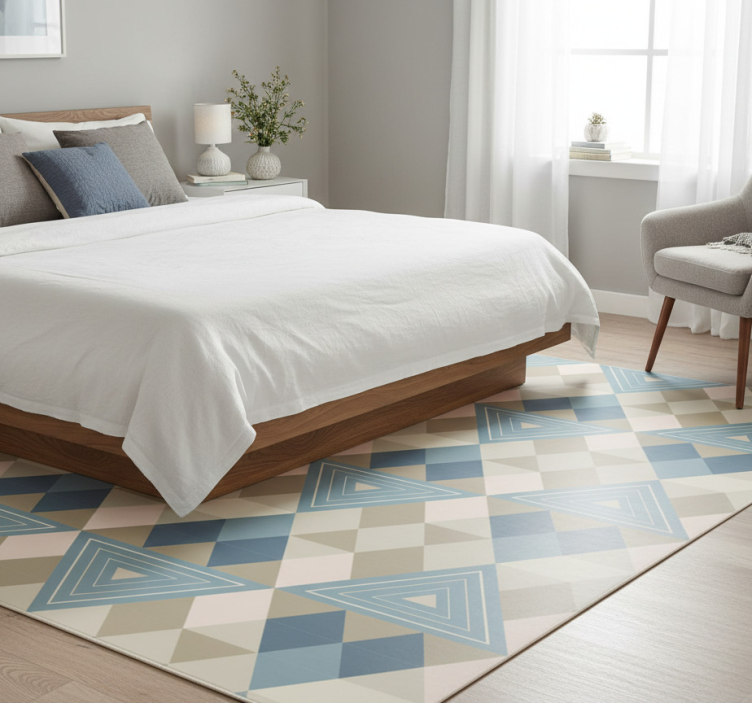 Reference: R23913Transform your space with the enchanting Bedroom vinyl rug with nordic geometric blue pattern, designed to bring a stylish touch to any bedroom! This stunning rug features a captivating geometric design in soothing blue tones, creating a harmonious atmosphere. Not only does it look fantastic, but it is also easy to clean, anti-slip, and scratch resistant. Enjoy the benefits of thermal isolation and a floor protector that enhances your living area beautifully.