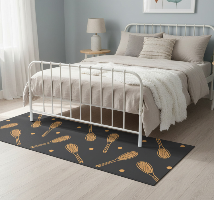 The Bedroom vinyl rug with orange rackets and balls design bedroom vinyl rug is an inspiring addition to your room! It effortlessly enhances the overall aesthetic while providing a cozy touch underfoot. Perfect for both kids and adults, this rug sparks joy and creativity, inviting you to relax and enjoy your space. Let your personality shine through with this unique decorative piece!