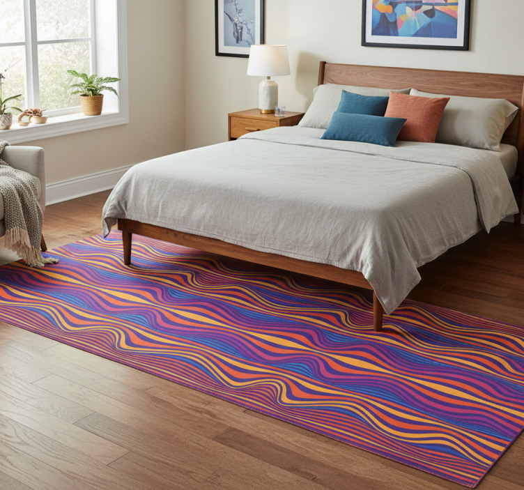 Adding the Bedroom vinyl rug with psychedelic wavy patterns bedroom vinyl rug to your decor is an inspiring way to infuse life and personality into your space! Its eye-catching design acts as a focal point, effortlessly enhancing the ambiance of your bedroom while offering a cozy place to step onto. This rug is a fantastic choice for those who appreciate artistic expression and wish to create a haven of comfort and style.