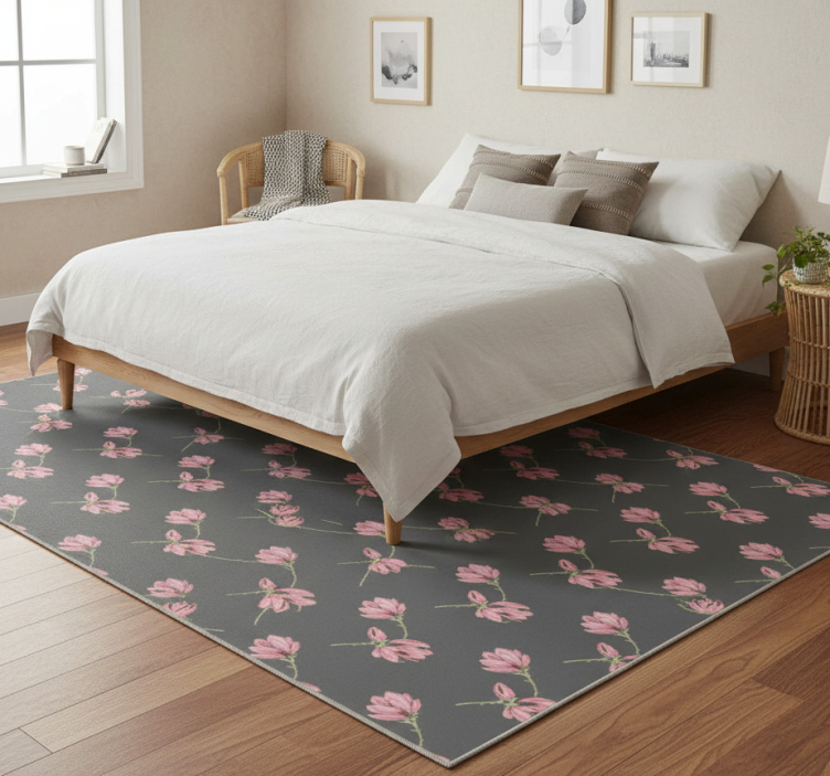 The Bedroom vinyl rug with small magnolia flowers on grey bedroom vinyl rug is an ideal choice for those looking to elevate their home decor. Its charming floral design adds a refreshing touch, effortlessly complementing various styles from modern to rustic. Your bedroom deserves a cozy ambiance, and this rug is the perfect way to achieve that! Let the beauty of magnolias breathe life into your space and inspire tranquility every day.