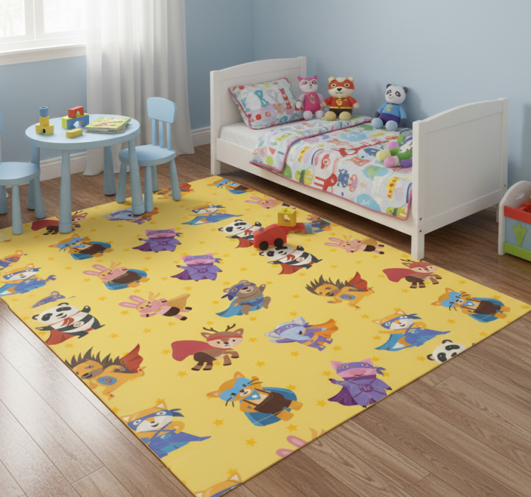 Bedroom vinyl rug with superhero pets on yellow