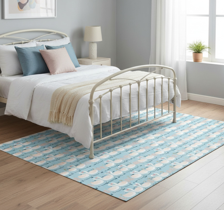 Caring for your Bedroom vinyl rug with swans in love on blue bedroom vinyl rug is a breeze! Simply wipe it down with a damp cloth or use a gentle cleaner to keep it looking fresh and vibrant, ensuring it remains a stunning focal point in your bedroom for years to come.