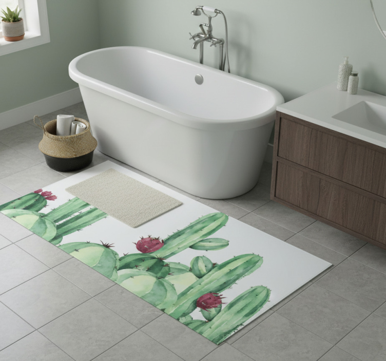 The Cactus plants bathroom vinyl rug is the perfect choice for those seeking a unique decorative element. Its lively design not only brightens the bathroom but also complements various decor styles, from modern to bohemian. With its affordable price and high-quality materials, this bathroom vinyl rug brings joy and comfort to your daily routine, inspiring creativity in your home.