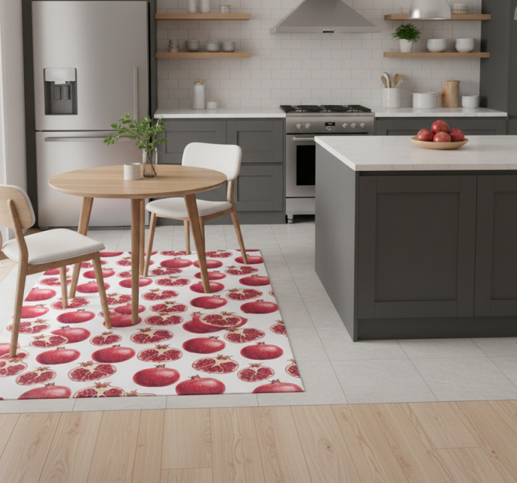 Reference: R23830Introducing our stunning Colorful pomegranates kitchen vinyl rug, a vibrant addition to your kitchen that combines beauty and functionality! Featuring a lively graphic design of luscious pomegranates, this rug is perfect for those who appreciate a touch of nature in their home. The rich colors and intricate patterns create a warm and inviting atmosphere, making your kitchen the heart of your home!