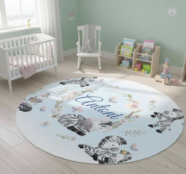 Reference: R20173Transform your space with our stunning Animal vinyl rug featuring baby zebras with name. This delightful design showcases playful baby zebras in vibrant colors, bringing a joyous and whimsical touch to any room. Crafted to be both visually appealing and practical, this rug is perfect for children's rooms, nurseries, or any playful area in your home!