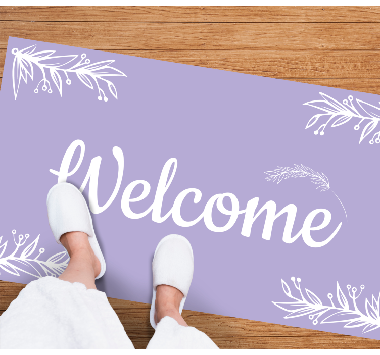 If you're looking to add a touch of elegance and originality to your home decor, then this vinyl rug is the perfect solution. Featuring a stunning illustration of delicate flowers and plants surrounding the word 'Welcome' in white, set against a beautiful purple background, this rug is guaranteed to make a statement in any entrance hall or room.