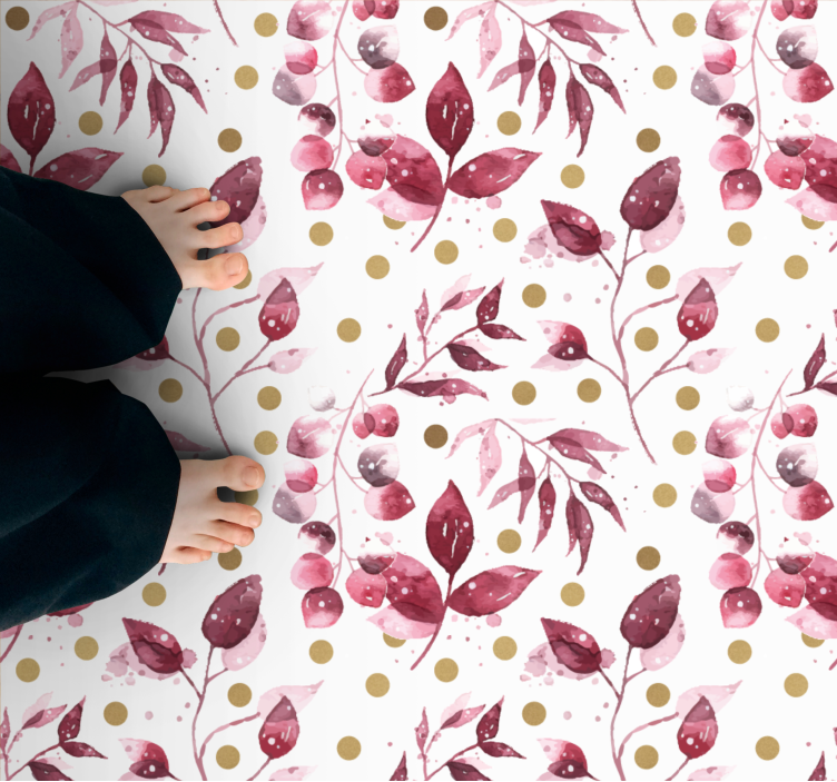 Introducing our stunning Flower vinyl rug botanical print design, a beautiful fusion of burgundy, hand painted illustrations, and vibrant leaves that create a captivating pattern. This exquisite piece embraces the art of watercolour with hints of pink, green, and gold, bringing a touch of nature into your living space. Transform any room with this delightful design!