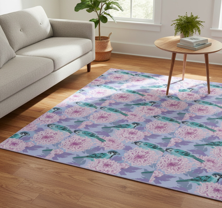 Flower vinyl rug featuring pink garden flowers with birds