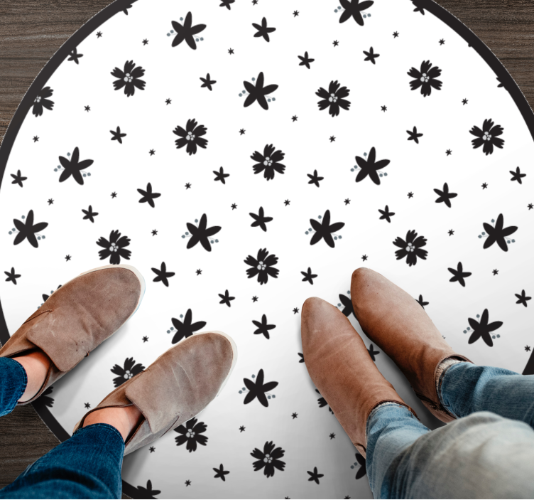 Transform your space with our stunning Flower vinyl rug floral star design, featuring a captivating blend of black and white flowers arranged in a mesmerizing pattern. This chic rug adds a touch of elegance and charm to any room, making it a perfect choice for those who appreciate beauty and style!
