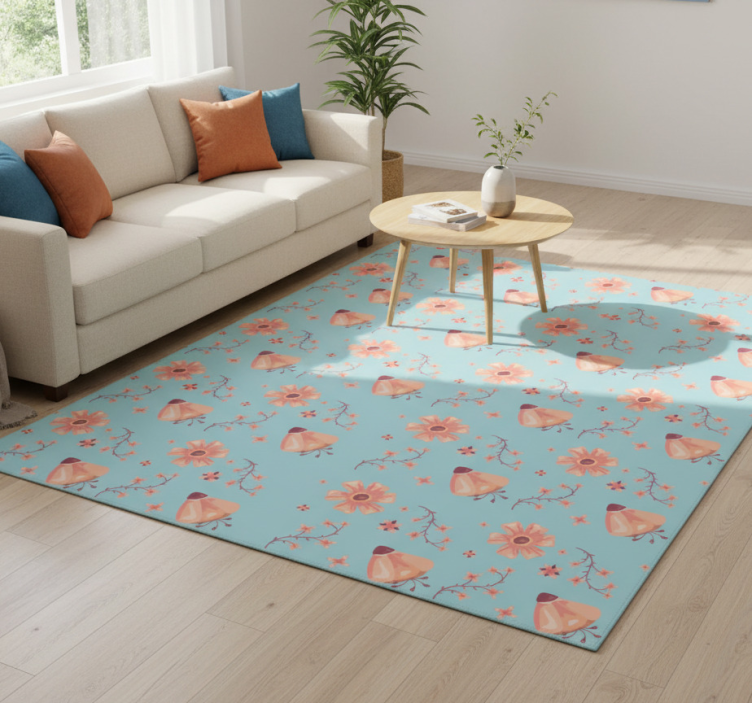 Flower vinyl rug with orange flowers on blue