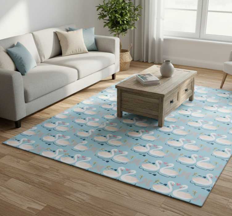 Flower vinyl rug with swans in love on blue