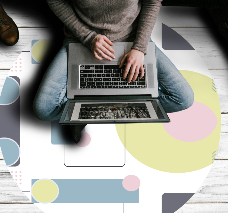 Transform your living space with our stunning Geometric vinyl rug with abstract circular shapes. This modern design features an array of abstract patterns and vibrant shapes in mesmerizing circles of blue, pink, and yellow. Its geometric appeal effortlessly elevates any room, making it a perfect choice for those who appreciate contemporary aesthetics!