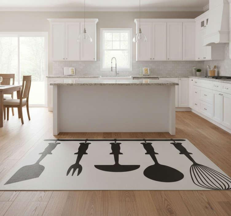 Choosing our Kitchen vinyl rug with hanging kitchen utensils for your home decor is a fabulous way to infuse your kitchen with style and creativity! This rug is designed to complement your kitchen's ambiance beautifully, making it an ideal centerpiece that sparks joy and inspiration while cooking. Its unique artwork inspires a love for culinary endeavors and creates an inviting atmosphere for family and friends alike!