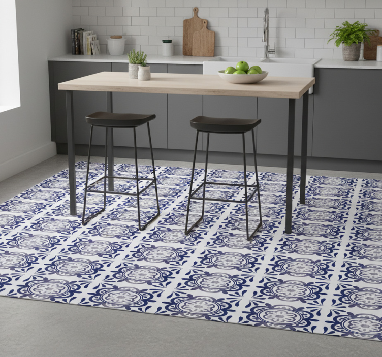 The Kitchen vinyl rug in antique blue spanish tile kitchen vinyl rug not only enhances your kitchen's decor with its beautiful design but also offers a unique way to express your personal style. Imagine stepping onto this lovely rug while preparing meals or enjoying your morning coffee! It brings warmth and color to the space, making every moment spent in your kitchen a delightful experience.